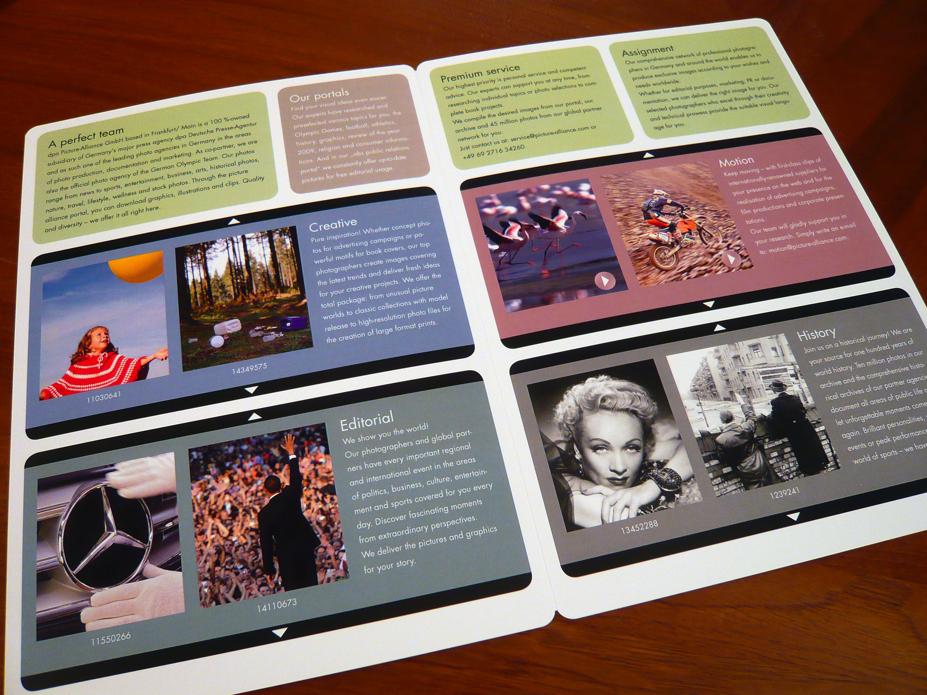 Ein wichtiger Teil des Corporate Designs der dpa picture alliance GmbH sind die abgerundeten Ecken. Der bei uns im Digitaldruck realisierte Folder nimmt dieses Element konsequent auf. Der Aufpreis gegenüber der eckig-spitzen Version ist moderat und das Ergebnis, wie man in den Bildern sieht, wirklich ausgesprochen attraktiv.
