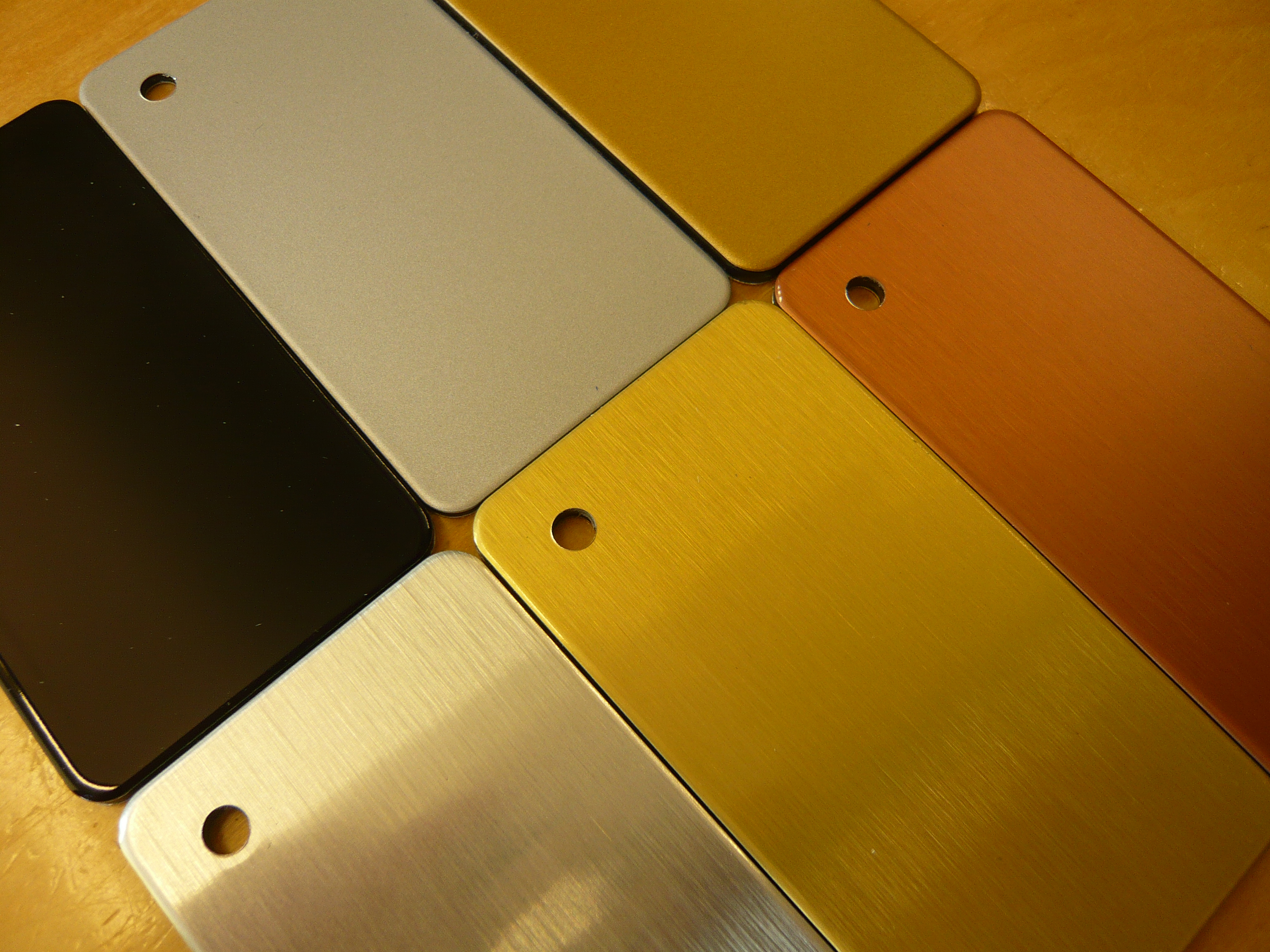Die klassischen weißen Dibond Platten sind als widerstandsfähige Schilder und Werbetafeln wohl bekannt. Die pragmatischen Mütter haben aber auch ausgesprochen charmante Töchter. Und die sind nicht ganz so bekannt. Wir verarbeiten immer mal wieder Gold-, silber- und kupferfarbene Platten mit gebürstetem Finish. Die Oberflächen gold und silber sind auch glatt erhältlich. Ebenso eine tiefschwarze, hochglänzende Version. Die Platten lassen sich im digitalen Siebdruck gut bedrucken und eignen sich auch für außergewöhnliche Anwendungen, wie zum Beispiel 3 mm starke Mailings in Postkartenform.
