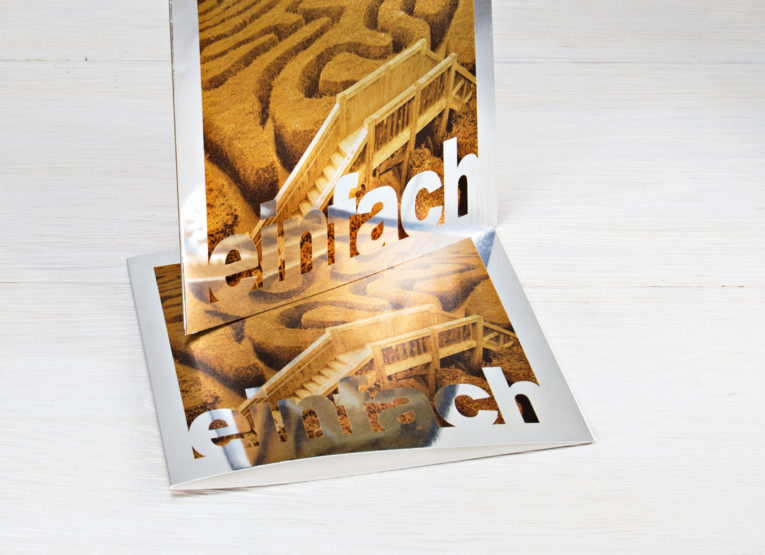 Einen glänzenden Auftritt im wahrsten Sinne des Wortes hat man mit dieser Klappkarte aus spiegelnd glänzendem Karton auf den Außenseiten. Der Druck erfolgte im digitalen UV-Siebdruck – damit haften die Farben zuverlässig auf dem anspruchsvollen Karton.