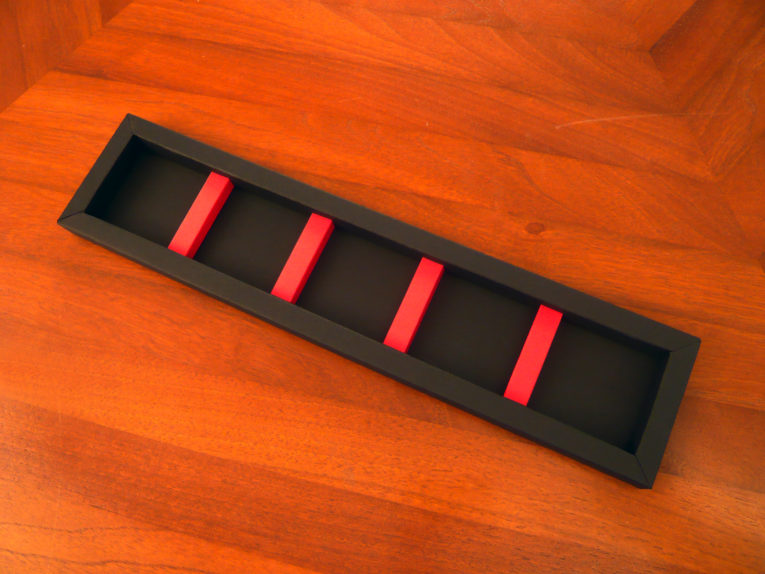 Diese wunderbare Rahmenschachtel mit Schiebemechanik beherbergt auch noch ein Innenleben zur Unterteilung. Wie es fast immer bei uns ist: Digital gestanzt und handkonfektioniert lassen sich solche und ähnliche Schachteln in kleinen Mengen schnell und preiswert herstellen. Die Schachtel ist ca. 350 x 80 x 20 mm groß. Ein Kommentar aus unserem Haus bei erstmaliger Ansicht der Schachtel: „Sieht irgendwie wie ein Tablettenportionierer für Großtabletten aus” 😉