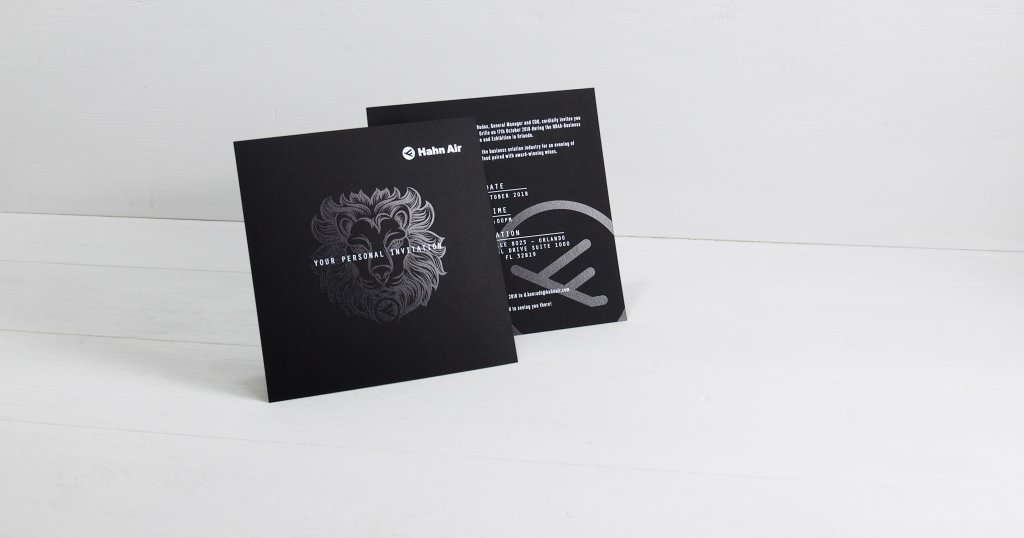 Vor einiger Zeit haben wir eine Einladungskarte für Hahn Air produziert. Schwarzer Karton, spürbar schwer, 210 mal 210 Millimeter. Kein Versuch, Aufmerksamkeit zu erzwingen. Keine Erklärung, warum diese Karte besonders ist. Sie war es einfach. Man nimmt sie in die Hand und versteht, dass hier nicht pflichtgemäß eingeladen wurde. Hier sollte ein Rahmen gesetzt werden.