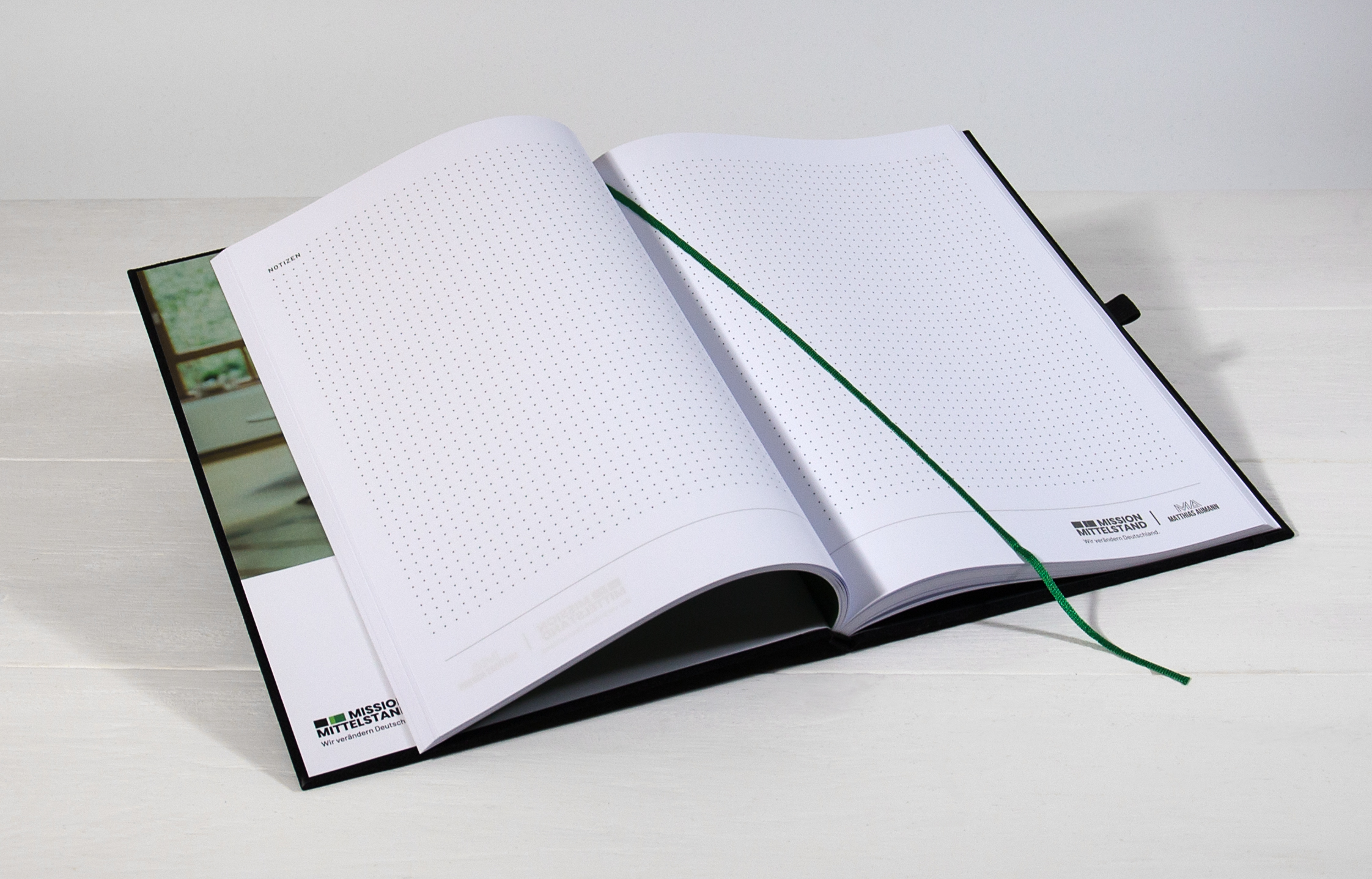 Dazu eine Heißfolienprägung in dezent mattem Gold. Und schon ist ein prachtvolles Notizbuch fertig. Das kam bei unserem Kunden, der Mission Mittelstand in Cloppenburg, so gut an, dass er nach wenigen Monaten bereits die nächste Auflage geordert hat.