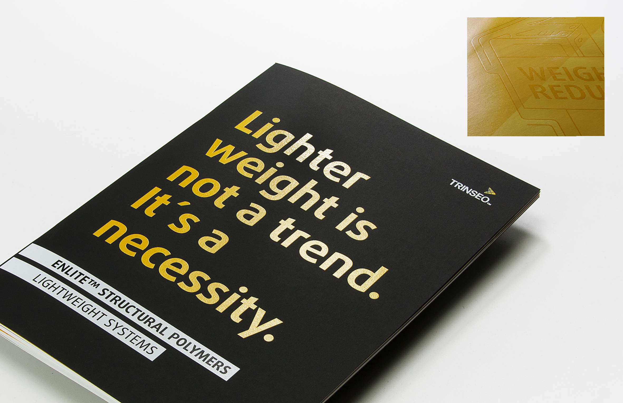 Der Grund ist in erster Linie die vollkommen faszinierende und edle Haptik und Optik des Umschlags. Dazu trägt das Umschlagmaterial entscheidend bei. Das 380g schwere Curious Skin ist ein durchgefärbter, mattschwarzer Karton mit einer glatten, ein wenig samtenen Haptik. Der Karton ist unempfindlich gegen Fingerabdrücke und bleibt auch bei intensiverer Benutzung ansehnlich. Auf dieser Grundlage haben wir im digitalen Siebdruck ein hochdeckendes Reliefweiß aufgebracht – so werden die (typo-)graphischen Elemente nicht nur sichtbar sondern auch deutlich fühlbar. Damit nicht genug: Die Headline wurde zunächst in Reliefweiß gedruckt um dann mit einem wunderschönen Goldton (4c, keine Sonderfarbe) übergedruckt zu werden. Das Ergebnis ist schlicht eine Show! Im inneren der Broschüre setzt sich das haptische Erlebnis fort. Auch hier sind diverse Elemente mit (digitalem) Relieflack veredelt und schicken die Finger des Lesers und der Leserin immer wieder auf eine Entdeckungsreise.