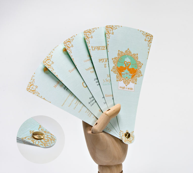 Gut: rechteckige, runde und formgestanzte Einladungskarten sind bei uns ja an der Tagesordnung. Und selbst da gibt es schon ausgesprochen charmante Vertreter ihrer Art. Diese Einladung geht noch einen Schritt weiter und verteilt die Informationen auf 5 einzelne Blätter. Um den Fächerlook anzudeuten, wurden die einzelnen Elemente formgestanzt und dann mit einer messingfarbenen Buchschraube verbunden.