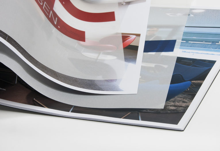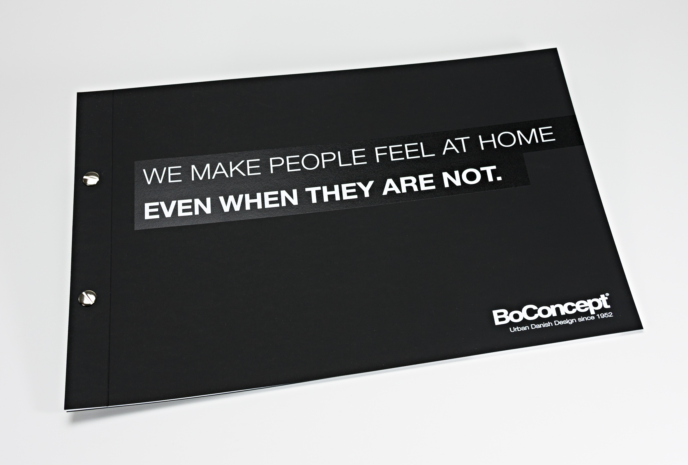 Für BoConcept in Frankfurt haben wir diese ultracoole Broschüre produziert. Außen begeistert der mattschwarze Karton (Curious Skin in 380g) mit digitalem Siebdruck in lackschwarz und reliefweiß. Dazu die silbern glänzenden Buchschrauben und das reduzierte Design: Nur gut! Die Informationen auf den Innenseiten machen sich durch Overlays aus Transparentpapier spannend. Damit solche Booklets sich halbwegs ordentlich blättern lassen, ist ein Querformat vorteilhafter als ein Hochformat. Zusätzlich haben wir den Deckel bundnah gerillt und so eine „Sollknickstelle” geschaffen.