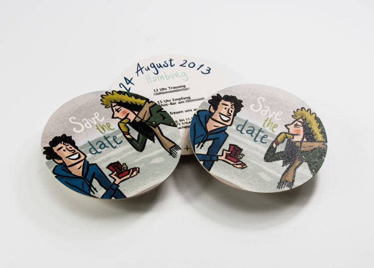 Nicht nur Steuererklärungen sollen ja (irgendwann demnächst) auf einen Bierdeckel passen. Auch die Einladung (Save the date) zu einer Hochzeit (sogar mit zwei Locations) verbraucht nicht mehr Platz, wenn man sich auf das Notwendige beschränkt. Und dem Budget tun solche wenig aufwändigen Drucksachen auch gut. Bleibt mehr für die Bespassung der Gäste in der Bar :-). Digitaler Siebdruck auf 1,4 mm starken Bierfilz und anschließend digitale Stanzung zum runden Deckel.